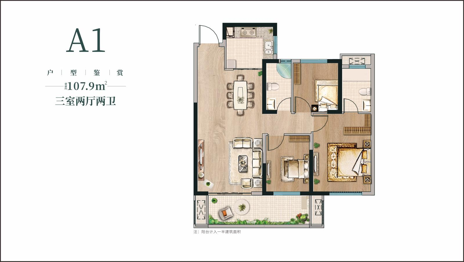 A1戶型(高層) 建筑面積:107.9㎡ 三室兩廳兩衛 進門帶入戶玄關,出入更加從容; 餐客廳一體化,客廳3.8米大開間; 6.4m全朝南的大陽臺設計,觀景效果極佳;主臥南北通透,帶獨立衛生間,私密性好;戶型周正實用,功能布局合理。