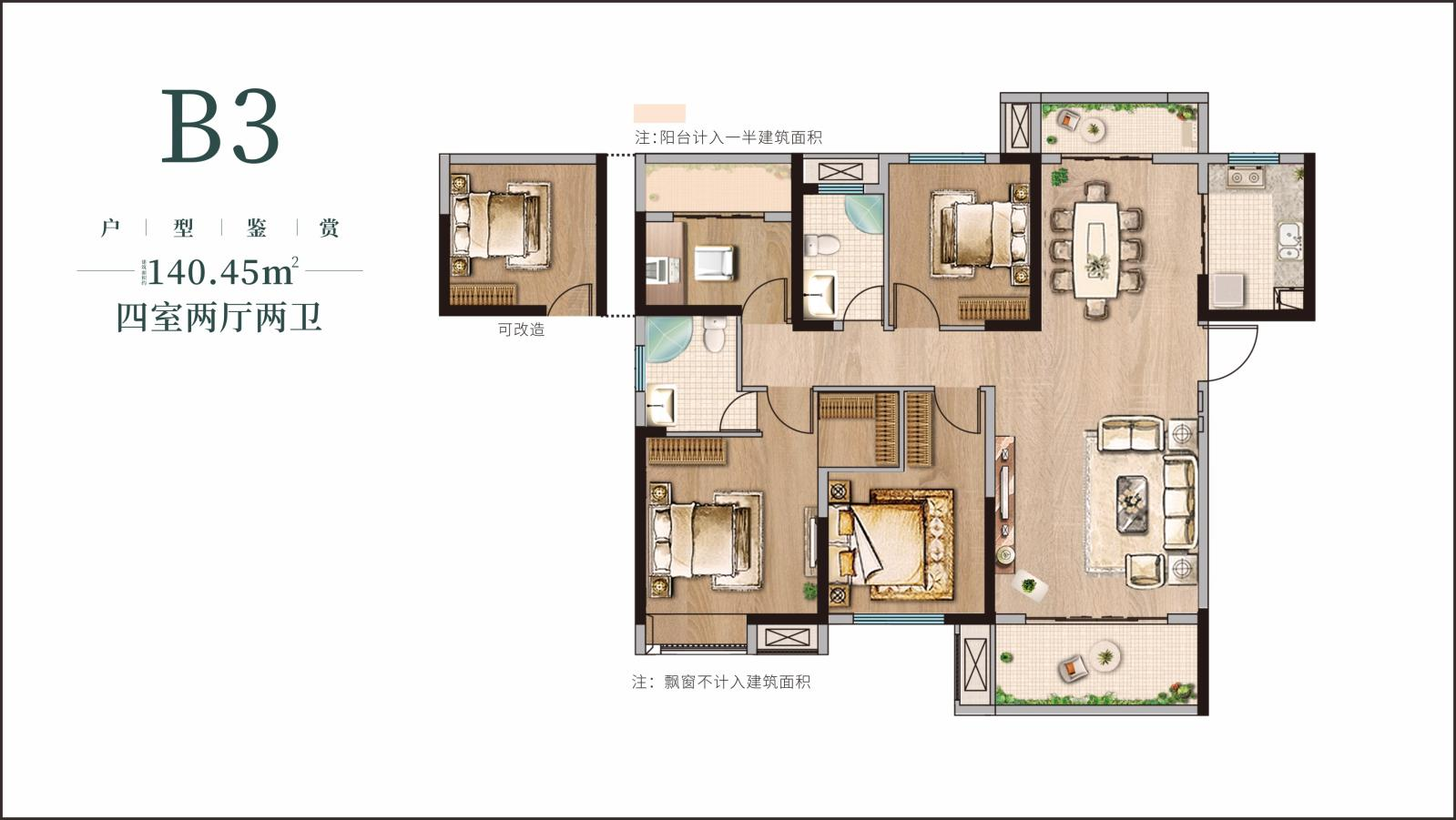 B3戶型(高層) 建筑面積:140.45㎡ 四室兩廳二衛 三陽臺設計,南北通透,通風采光效果極佳,面積大; 南向4.5米開間超大景觀陽臺,美景一覽無余; 四明戶型(明廚明廳明臥明衛),居家盡享主人尊貴。